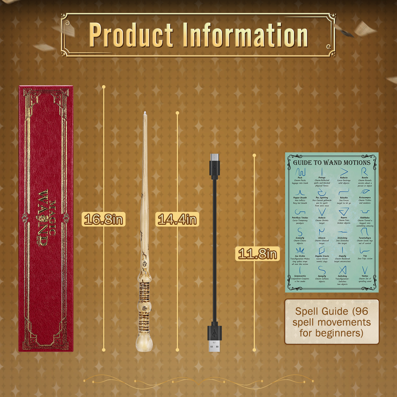 【Complete Gift Set】This elegant set includes the wizard wand, a charging cable, a beautiful gift box, and a 96-spell movement guide, providing everything you need for an immersive experience.