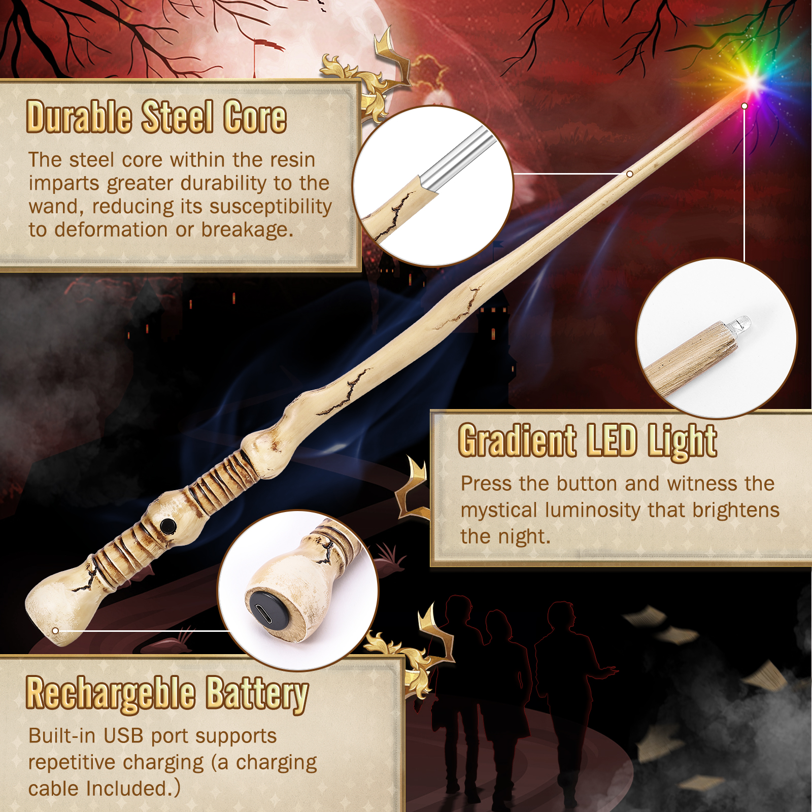 【Convenient Rechargeability】Equipped with a USB interface and a charging cable, this witch wand offers hassle-free recharging, ensuring you’re always ready for your next magical moment.