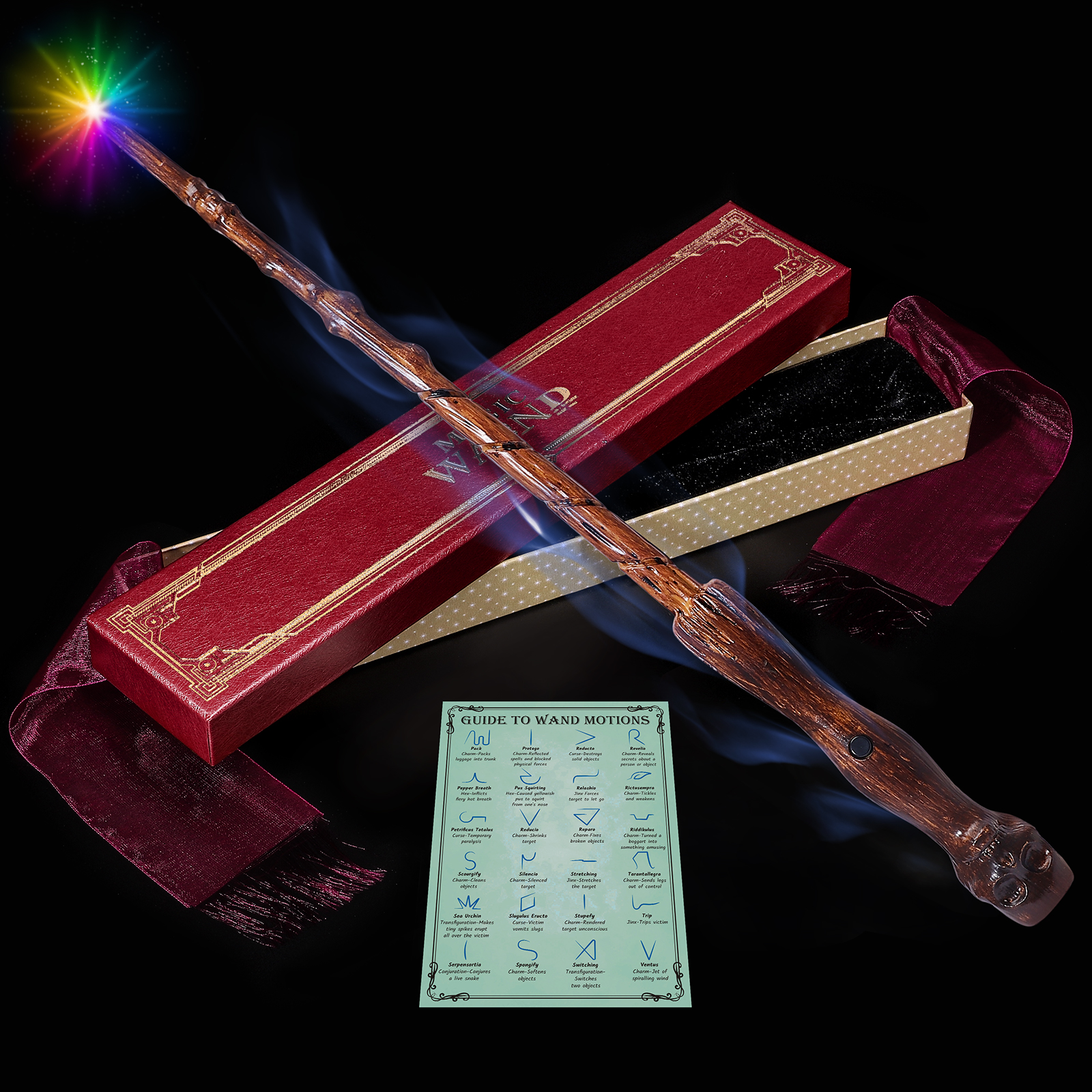 【Complete Gift Set】This elegant set includes the wizard wand, a charging cable, a beautiful gift box, and a 96-spell movement guide, providing everything you need for an immersive experience.