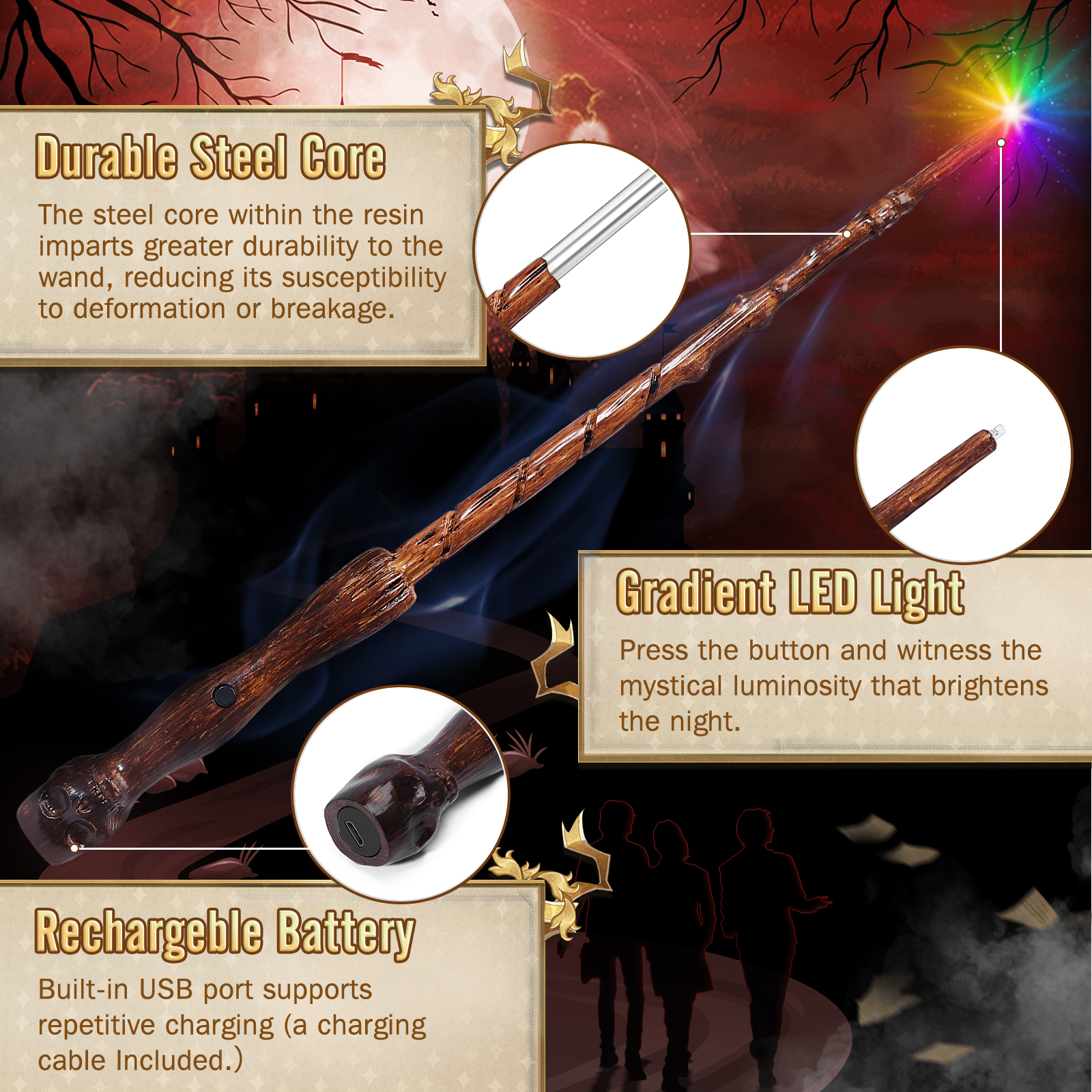 【Convenient Rechargeability】Equipped with a USB interface and a charging cable, this witch wand offers hassle-free recharging, ensuring you’re always ready for your next magical moment.